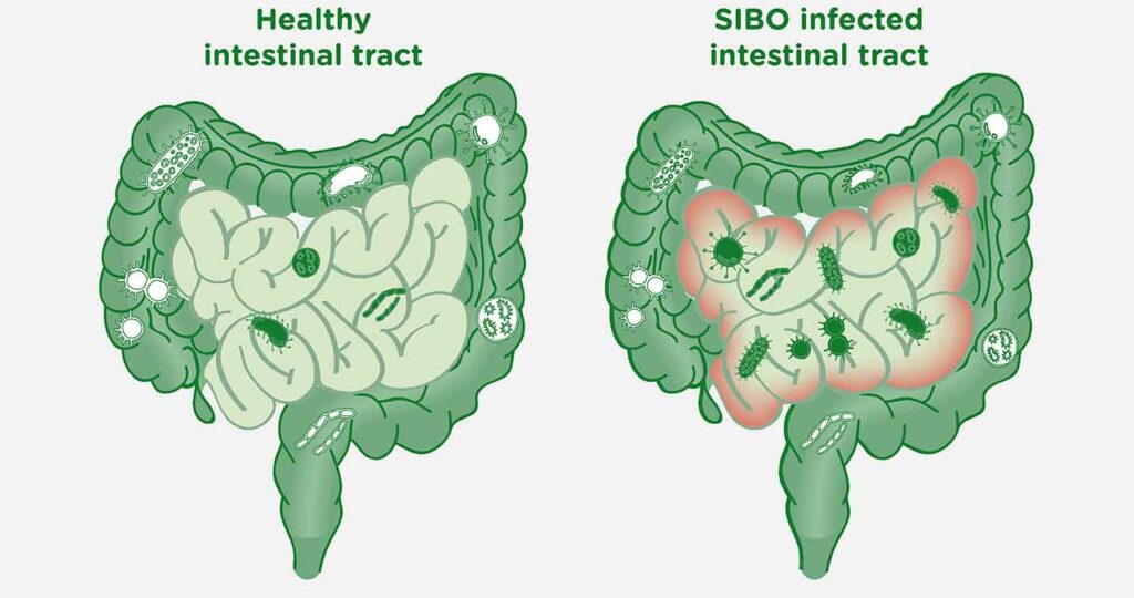 Because our small intestine is pretty sensitive, it doesn’t get on well when it has an increased number of invading microbes! This can cause symptoms like abdominal pain, bloating, foul-smelling gas, and diarrhoea. If left untreated, it could affect the body’s ability to digest food and absorb nutrients properly. That can lead to nutritional deficiencies, although this is rare.