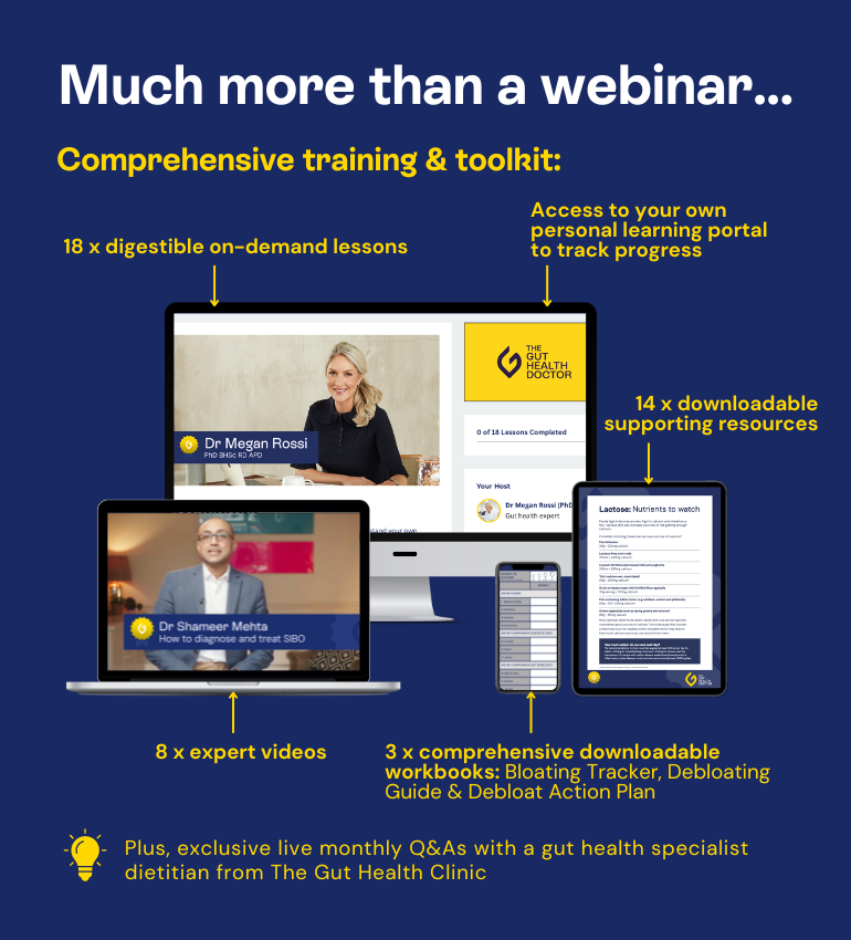 Led by an award-winning gut health scientist at King’s College London, Sunday Times bestseller and founder of The Gut Health Clinic; Dr Megan Rossi’s (PhD, RD) Bloating Masterclass will guide you on a journey to help you beat burdensome bloating for good.