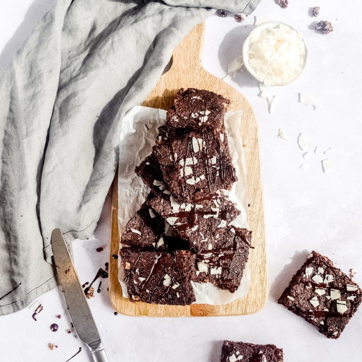 Chocolate & coconut brownies. Warm, fudgy, no added sugar and so simple to make! You know us… we are adding extra veggies in there too! Trust us, the courgette/zucchini works.