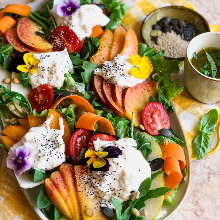 Savour the last few weeks of al fresco dining with a vibrant salad bursting with seasonal flavour. It’s crisp and refreshing but wonderfully comforting, thanks to the creamy burrata. This end of summer salad with peaches and pears is the perfect way for you and your gut microbes to see the summer out on a delicious, prebiotic high.