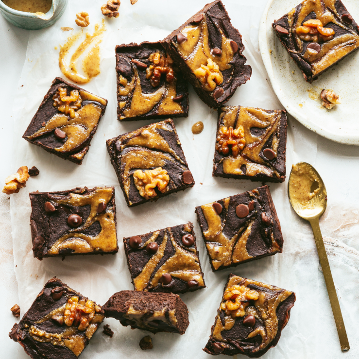 - Spoon the mix into a lined square baking tray, swirl in the walnut butter, then dot in the chocolate chips and the rest of the whole walnuts.