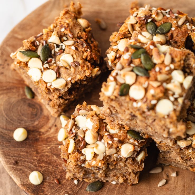 Are you a white chocolate fan? These nutty white chocolate blondies make a satisfying snack with gut-nourishing benefits. Cannellini beans, nut butter, and mixed seeds deliver the perfect balance of creamy and crunchy with a bonus fibre fix, while the chocolate chips bring the sweetness. P.S. If you want to follow along with Megan, check out her recipe video on Instagram here.