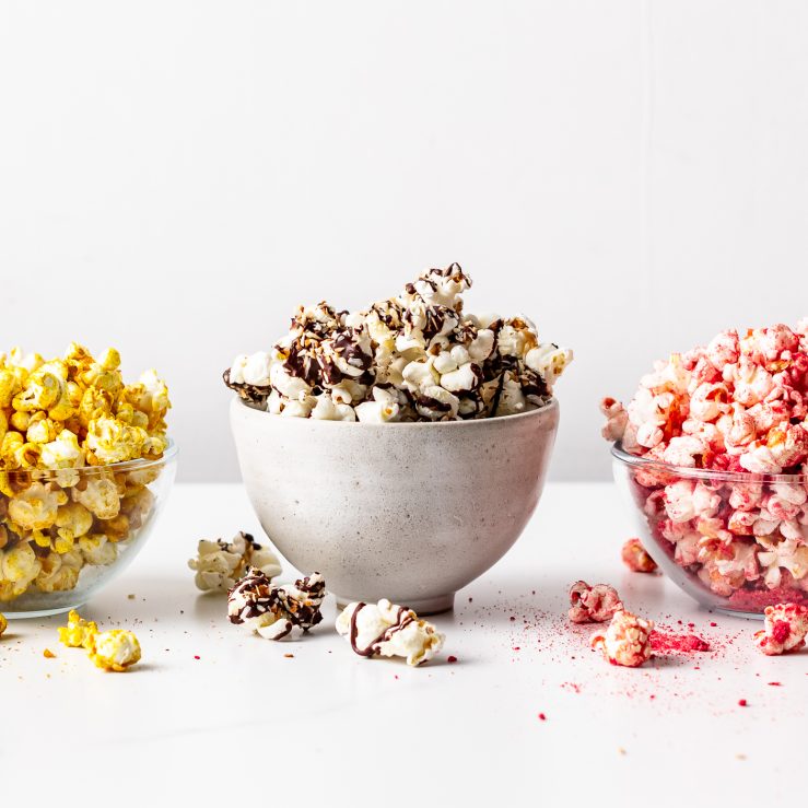 - Spread the popcorn over a sheet of greaseproof paper, then drizzle over the dark chocolate and sprinkle the coconut. Leave until the chocolate has firmed up.