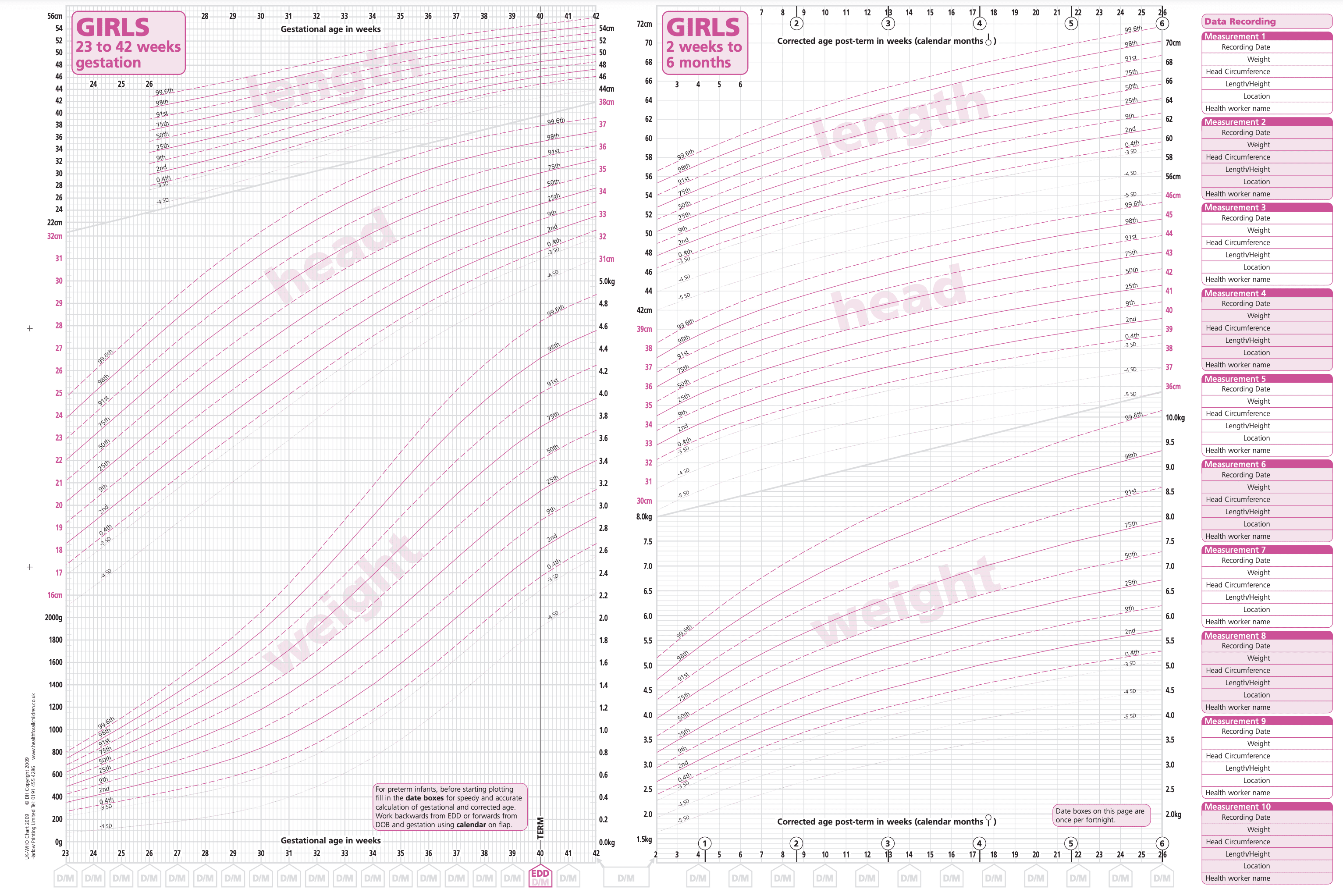 Babies who are born prematurely will have their growth plotted on different growth charts or will have it plotted based on their corrected age.This means that their growth will always be measured taking into account the weeks + days that they were born early (based on 40 weeks gestation).