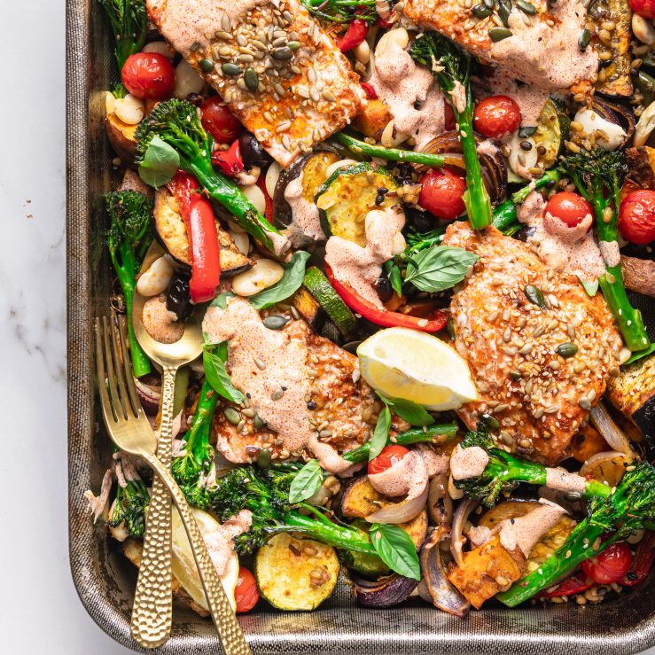 Enjoy this easy and deliciously nutritious one-pan dish. High in protein and fibre, it’s packed with plant-based diversity and a hit of Omega-3 from the succulent salmon fillets.